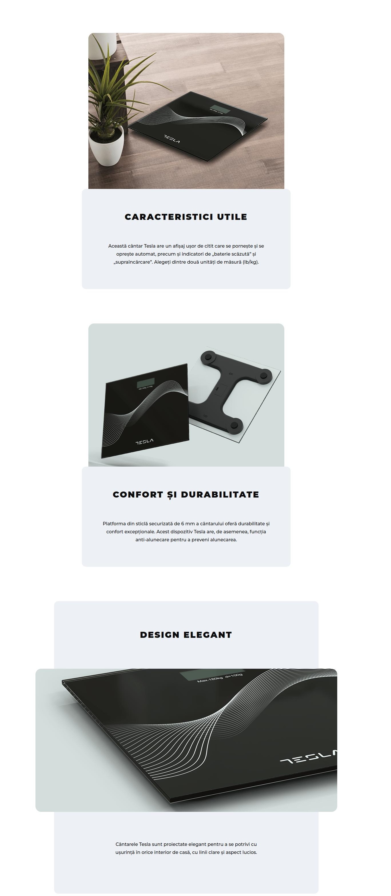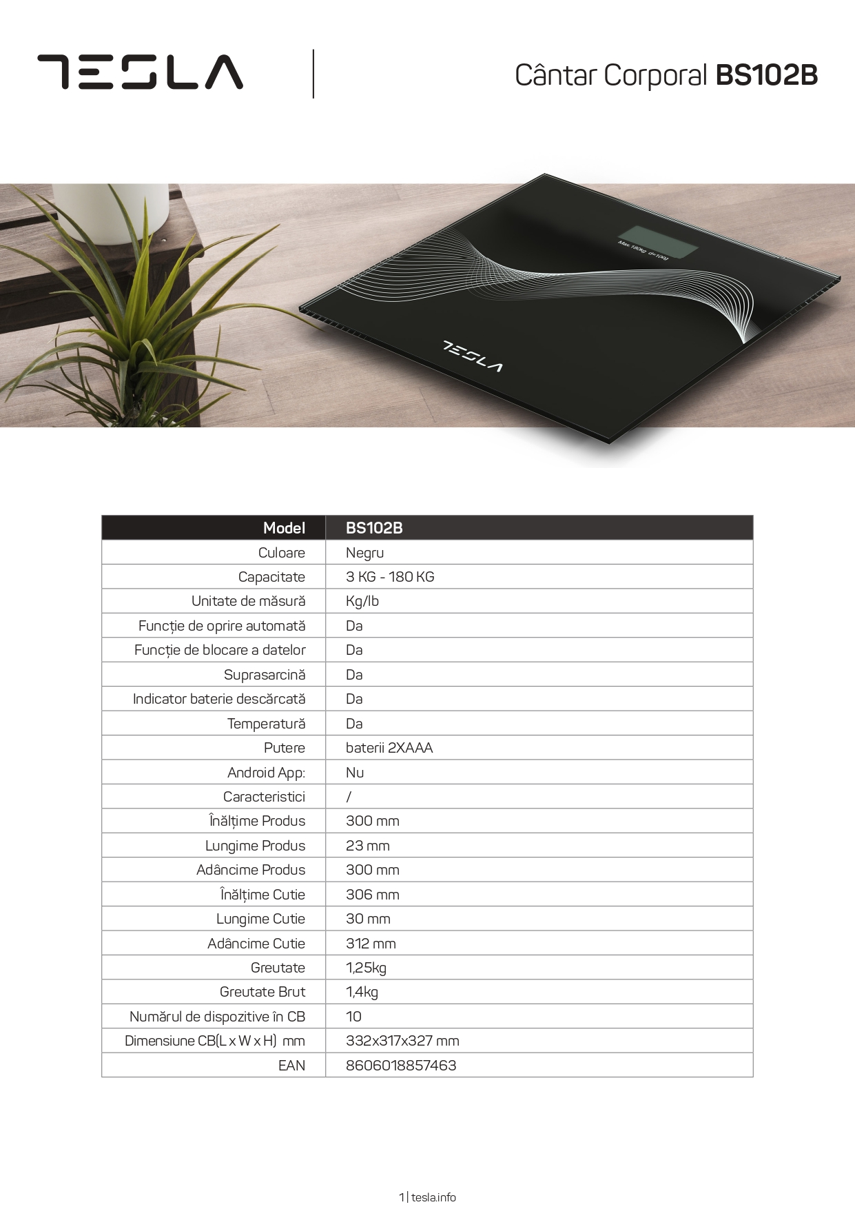 Cantar corporal Tesla BS102B, 180kg, baterii 2xAAA30x30cm, Negru