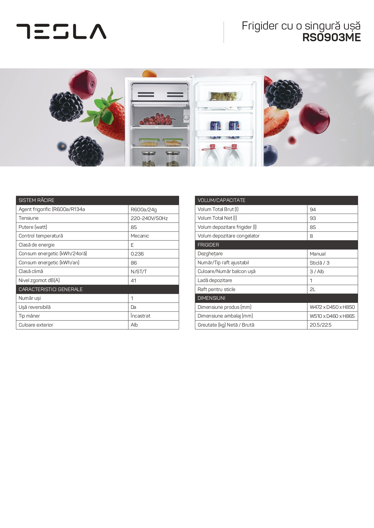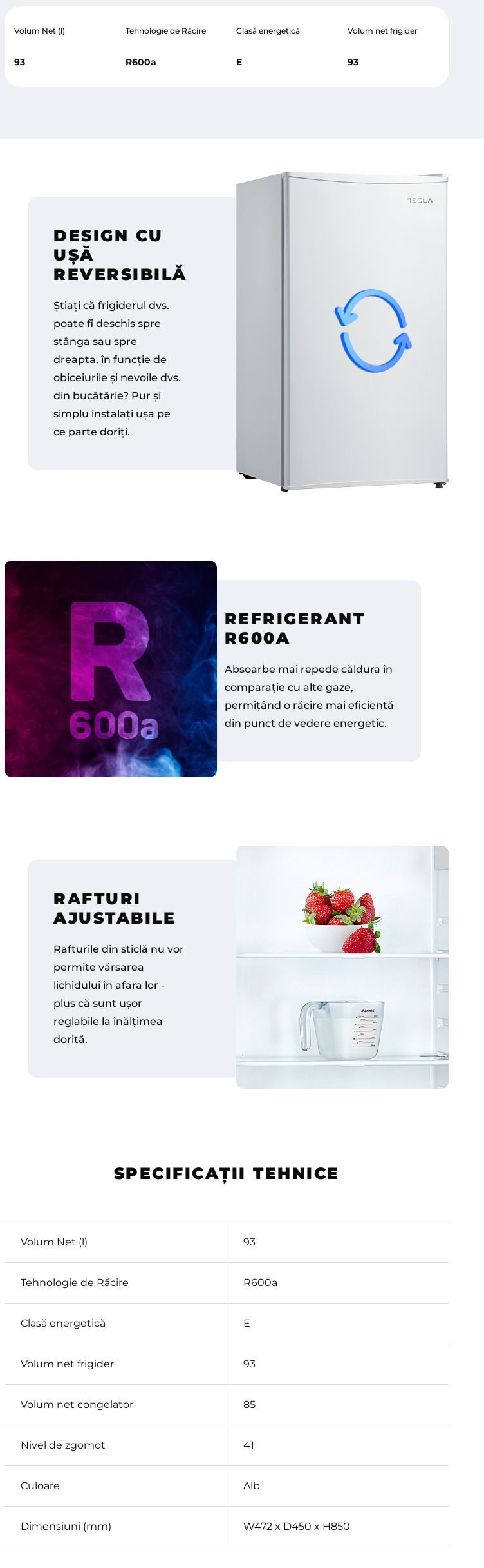 Frigider cu o usa Tesla RS0903ME, E, 93L, H85 Usa reversibila, Alb